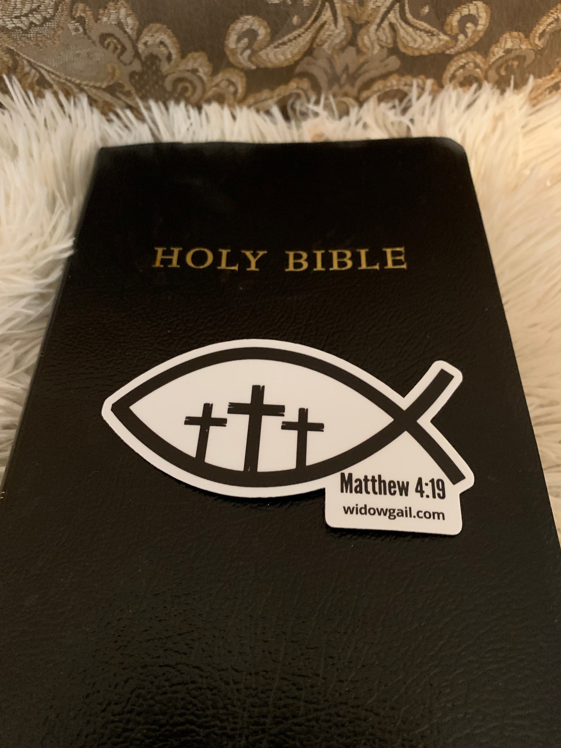 FREE GIFT : In addition to this sticker I will send 1 miniature pocket size bible, per household (first order). Thank you for your support at WidowGail.com